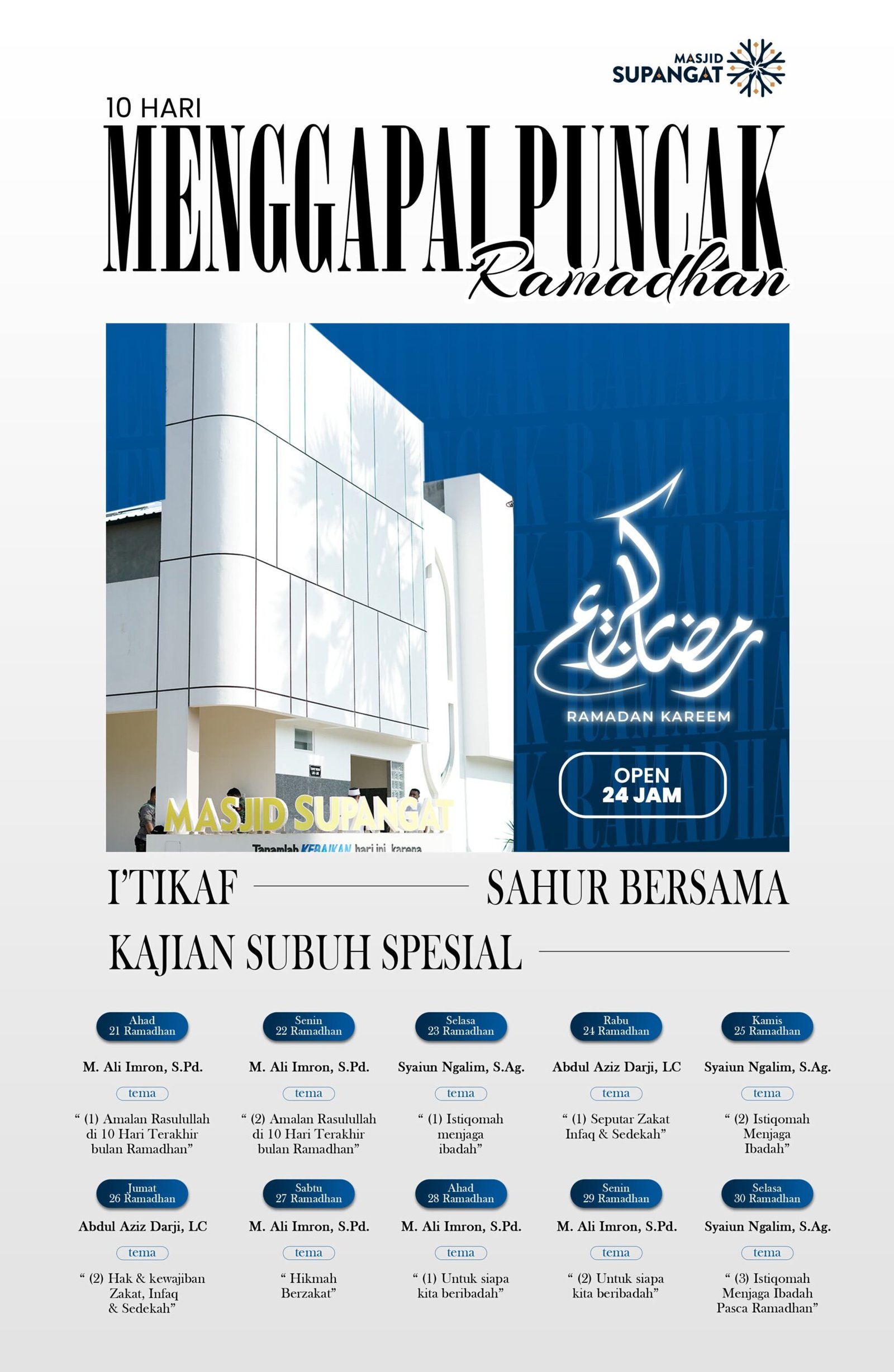 Masjid Supangat Muhammadiyah Panyuran Tuban menyelenggarakan serangkaian kegiatan istimewa selama 10 hari terakhir bulan Ramadhan. Acara ini bertujuan untuk menambah kehikmatan dalam menjalani ibadah di bulan suci Ramadhan.