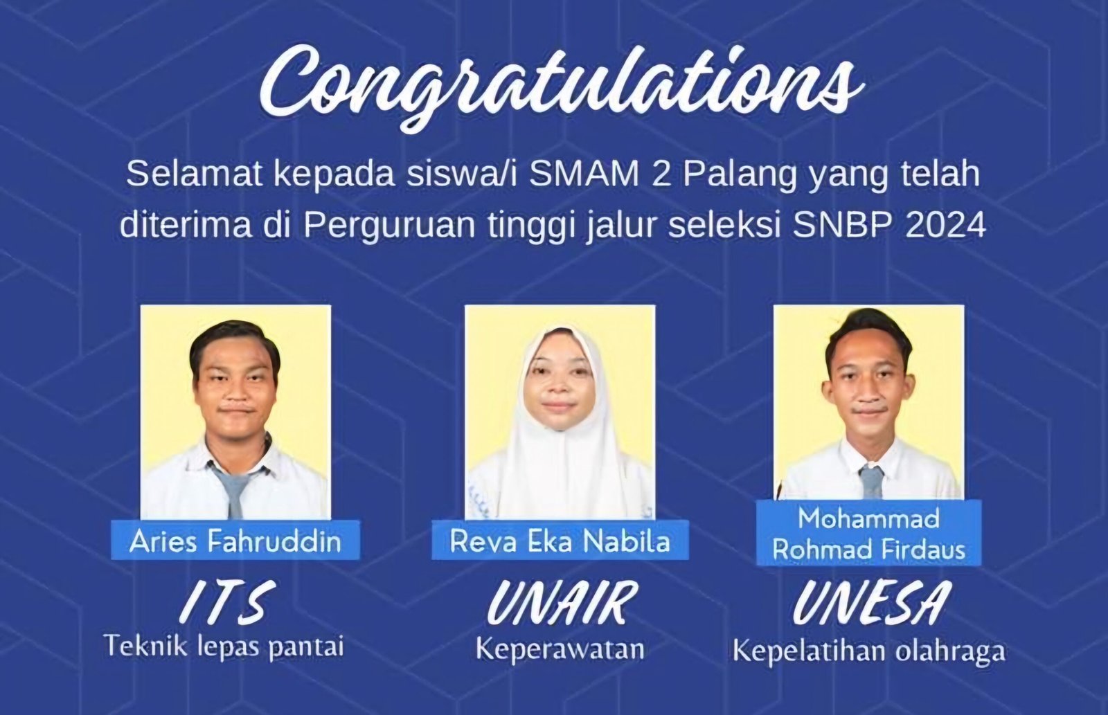 PDMTUBAN.COM-SMA Muhammadiyah 2 Palang kembali menorehkan prestasi gemilang dengan berhasilnya tiga siswanya diterima di perguruan tinggi negeri ternama melalui jalur Seleksi Nasional Berdasarkan Prestasi (SNBP) 2024. Muhammad Rohmad Firdaus diterima di Universitas Negeri Surabaya (UNESA), Aries Fahrudin diterima di Institut Teknologi Sepuluh Nopember (ITS), dan Reva Eka Nabila diterima di Universitas Airlangga (UNAIR). Keberhasilan ini merupakan bukti nyata dari dedikasi dan kerja keras siswa, serta dukungan penuh dari para guru dan orang tua.